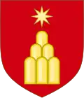 De gueules a six montagnes d'or, une sur deux, deux sur trois, la plus haute surmontée d'une étoile de même. Différences entre dessin et blasonnement : outre que les montagnes semblent assez peu montagneuses et surtout sont "isolées" (non dit), l'étoile a huit rais (également non dit).. |
