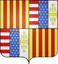 parti en 1, d'or à six fleurs de lys d'azur posées 3, 2 et 1 et en 2, d’argent, à la croix pattée de gueules cantonnée de quatre aigles de sable au vol abaissé ; sur-le-tout, écartelé en 1 et 4, de gueules au château d'or ouvert et ajouré d'azur et en 2 et 3 d'argent au lion de gueules armé, lampassé et couronné d'or, enté en pointe du sur-le-tout d'argent à une pomme grenade de gueules, tigée et feuilleté de sinople ; sur-le-tout-du-tout d'azur aux trois fleurs de lys d'or à la bordure de gueules chargée de huit coquilles d'argent posées en orle [9]. |