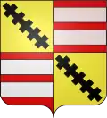 Écartelé, aux 1 et 4 d'or, une croix ancrée de gueules ; aux 2 et 3 d'argent, une hie de sable posée en bande accompagnée de six roses de gueules ordonnées en orle |