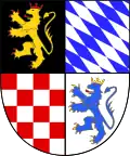 fuselé en bande d'azur et d'argent (Wittelsbach), sur-le-tout au lion d'or, armé, lampassé et couronné de gueules. | |