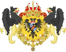 parti de un coupé de deux, au 1 de gueules, au lion d'argent à la queue fourchée passée en sautoir, couronné, armé et lampassé d'or, qui est de Bohême, au 2 d'azur, à l'aigle échiquetée d'argent et de gueules, becquée, languée, membrée et couronnée d'or, qui est de Moravie, au 3 d'or à l'aigle de sable, armé, becqué et langué de gueules, portant sur son cœur un croisant d'argent surmonté d'une croix de même, qui est de Silésie, au 4 burelé d'argent et d'azur de dix pièces, au lion de gueules, la queue fourchée passée en sautoir, armé, lampassé et couronné d'or, qui est de Luxembourg, au 5 coupé crénelé d'azur et d'or qui est de la Haute-Lusace et au 6 d'argent au bœuf de gueules issant sur une terrasse de sinople, qui est de la Basse-Lusace ; sur le tout parti de sable, au lion d'or, armé, lampassé et couronné de gueules, qui est du Palatinat et fuselé en bande d'azur et d'argent, qui est de Bavière enté en pointe de gueules à l'orbe d'or, qui est la dignité d'archi sénéchal du Saint-Empire[7]. |