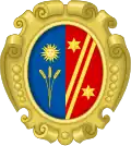 divisé en chevron d'azur à deux étoiles d'argent, sur or à une croix latine pattée de sable, le pied fendu en chevron ; au chevron de sable, brisé sur la division[14],[15]. |