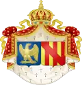 Coupé : I, parti : a, d'azur, à deux cornes d'abondance d'or passées en sautoir (Labour) ; b, d'azur, à un dauphin contournée d'argent (alias une queue de poisson couronnée) (Otrante) ; II, d'or, à une triquêtre issante d'une tête de Mercure de carnation (Île de Sicile) ; sur-le-tout d'azur, à l'aigle d'or, la tête contournée, au vol abaissé, empiétant un foudre du même (de Napoléon)[30]. Grandes armoiries avec manteau napolitain. Gironné de 15 pèces : I, en forme de franc-quartier, d'or, à une triquêtre issante d'une tête de Mercure de carnation (Île de Sicile) ; II, d'or au cheval contouné et effaré de sable (de Naples (ancien)) ; 3, d'azur, à deux cornes d'abondance d'or, passées en sautoir (du Labour) ; IV, coupé en A d'azur à une comète d'argent chevelée d'or, en B d'argent à un vol d'azur ; V, d'or, à l'aigle de gueules, couronnée du champ, issante d'une fasce denchée et abaissée d'azur (de Basilicate) ; VI, d'argent, à la croix potencée de sable (de Basse-Calabre) ; VII, écartelé en sautoir d'or, à quatre pals de gueules et d'argent, à la croix potencée de sable (alias d'Aragon et de Basse-Calabre) (de Haute-Calabre) ; VIII, D'or, à quatre pals de gueules, au dauphin d'argent, plongeant vers la pointe, brochant sur-le-tout (d'Otrante) ; IX, écartelé en sautoir d'azur et d'argent, à la crosse d'or, brochante sur-le-tout (de Bari) ; IX, d'azur, à un Saint-Michel d'or, terrassant un diable de sable, sur une montagne à trois coupeaux du deuxième, issante de la pointe (de Capitanate) ; XI, de gueules, à une étoile à huit rais d'or, ceinte d'une couronne de feuillage du même (de Molise) ; XII, coupé de gueules, à la couronne à l'antique d'or, et d'argent. (de Haut-Principat) ; XIII, d'or, à la hure de sable, surmontée d'un joug de gueules (des Basses-Abruzzes) ; XIV, d'azur, à l'aigle d'argent, surmontant une montagne d'or, issante de la pointe (des Hautes-Abruzzes) ; XV, de gueules accompagnée de deux croisettes alesées le tout d'argent ; sur-le-tout d'azur, à l'aigle d'or, la tête contournée, au vol abaissé, empiétant un foudre du même (de Napoléon) dans son pavillon de gueules[30]. |