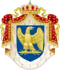 Parti de un et coupé de deux : en I, de gueules au château d'or ouvert et ajouré d'azur, en II, d'argent au lion de gueules armé, lampassé et couronné d'or, en III d'or à quatre pals de gueules, en IV de gueules aux chaînes d'or posées en orle, en croix et en sautoir, chargées en cœur d'une émeraude au naturel, en VI d'argent à une pomme grenade de gueules, tigée et feuilleté de sinople et en VI d'azur, de gueules au vieux et nouveau monde d'or entre les colonnes d'Hercule d'argent ; sur le tout un écu oval d'azur, à l'aigle d'or, la tête contournée, au vol abaissé, empiétant un foudre du même (de Napoléon)[30]. Grandes armoiries |