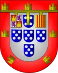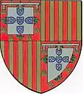 écartelé, au I et IV d'argent, à cinq écussons d'azur, posés en croix, les deux de flanc mis de côté, chaque écusson chargé de cinq besants du champ, posés en sautoir, à la bordure de gueules, chargée de douze châteaux d'or, donjonnés de trois tours, ouverts et ajourés d'azur, aux quatre fleurs de lys de sinople, brisé d'un lambel d'argent, chaque pendant chargé de trois mouchetures d'hermine (qui est d'Aviz-Coimbra), et au II et III d'or à 4 pals de gueules (qui est d'Aragon). |