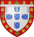 Rois de Portugal (1247-1383) - dynastie de Bourgogne d'argent aux cinq écus d'azur disposés en croix, chaque écu chargé de cinq besants d'argent disposés en sautoir, à la bordure de gueules chargée de onze châteaux d'or, donjonnés de trois tours, ouverts et ajourés d'azur |