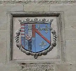 écartelé, en 1 et 4 coupé et parti en 3, au premier fascé de gueules et d'argent, au second d'azur semé de lys d'or et au lambel de gueules, au troisième d'argent à la croix potencée d'or, cantonnée de quatre croisettes du même, au quatrième d'or aux quatre pals de gueules au cinquième parti d'azur semé de lys d'or et à la bordure de gueules, au sixième d'azur au lion contourné d'or, armé, lampassé et couronné de gueules, au septième d'or au lion de sable armé et lampassé de gueules, au huitième d'azur semé de croisettes d'or et aux deux bar d'or. Sur le tout d'or à la bande de gueules chargé de trois alérions d'argent le tout brisé d'un lambel et d'une bordure de gueules ; et en 2 et 4 d'azur aux trois fleurs de lys d'or et au bâton péri de gueules. On trouve sur la façade de l'auditoire de Joinville : Accolé de Lorraine et de Bourbon. Il était fils de Claude Ier de Lorraine, duc de Guise et d'Antoinette de Bourbon-Vendôme. |