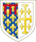 Louis Ier (1339 † 1384), duc d'Anjou, second fils de Jean II le Bon, roi de France. Il reprend les armes de son père Jean II avant 1350.