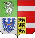 parti en 1 tiercé en pal d'or au lion de gueules armé, lampassé et couronné d'azur, de gueules à la fasce d'argent et d'or à la bande de gueules chargé de trois alérions d'argent, et en 2 d'azur, à l'aigle d'argent, becquée, languée et couronnée d'or[10]. |