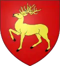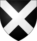 Armes : De sable au sautoir d'argent[21]. Cimier : une tête de cerf d'argent. Supports : deux cerfs d'argent. Devise : AV COEVR HARDI | |