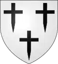Armes : De gueules à trois épées d'argent mal ordonnées, garnies et pommetées d'azur[43]. Cimier : une tête de griffon d'or. Supports : deux griffons d'or. Devise : BRANDELIX Variantes : épées garnies et pommetées d'or, de sinople.![]()