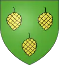 Armes : De sinople à trois pommes de pin d'or[14]. Cimier : une pomme de pin d'or. Supports : deux bras de carnation, sortant d'une nuée d'azur et portant une manipule d'hermine. Devise : POMMES DE PIN | |