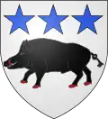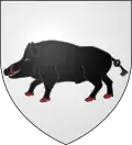 Armes : D'argent à un sanglier de sable onglé et défendu de gueules[32]. Cimier : une hure de sable, languée de gueules. Supports : deux sangliers saillants de sable. Devise : MAR CAR DAIC |