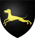 Armes : De sable à un chien courant d'or armé et lampassé de gueules[44]. Cimier : une tête de chien d'or, lampassé de gueules. Supports : deux chiens d'or, armés et lampassés de gueules. Devise : SOIT BIEN OV MAL Variantes : chien seulement armé. Ni armé ni lampassé. Colleté de gueules.![]()