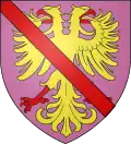 Armes : De pourpre à l’aigle bicéphale d’or membrée et becquée de gueules, à la fasce de sinople brochant[6]. Cimier : une tête d'aigle d'or, becquée de gueules. Supports : deux aigles d'or, becquées et membrées de gueules. Devise : NÉ POVR MOVRIR | |