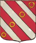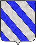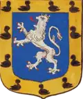 D'azur semé de besants d'or, au lion d'argent, la queue contournée, armé de gueules et lampassé d'or. |