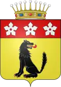 D'or, au loup assis de sable, la tête contournée, lampassé de gueules ; au chef du dernier, chargé de trois quintefeuilles d'argent.[16] Surmonté d'une couronne comtale depuis le 27/10/1819. |