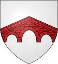 Coupé : au 1, parti d'azur à une tour d'or ouverte et ajourée de sable surmontée de trois étoiles rangées en chef d'argent, et de gueules à l'épée haute d'argent ; au 2, d'or à un pont de sable de quatre arches soutenu d'une rivière de sinople en champagne.[20] |