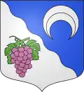 Tranché en onde d'azur et d'argent, à un croissant renversé d'argent sur l'azur, au raisin au naturel feuillé de sinople sur l'argent.[43]