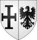 Parti d’argent, à la croix potencée de sable ; et d’argent, à l’aigle éployée de sable |