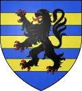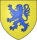 D'or à trois bannières rangées d'azur, au chef de gueules chargé d'un lion passant d'argent.[24]