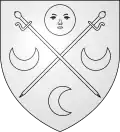De … à deux bourdons de pèlerin, passés en sautoir, accompagnés en chef d'une lune, aux flancs de deux croissants, et en pointe d'un croissant contourné.[39] |