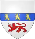 D'or, au lion de gueules issant d'une rivière d'argent mouvant de la pointe de l'écu ; au chef d'azur, chargé de trois étoiles d'or.[50]