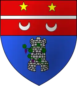 Coupé : au 1, de gueules, à la fasce en divise d'argent, accompagnée en pointe de deux croissants rangés du même, et en chef de deux étoiles d'or ; au 2, d'azur, à la tour d'argent, entourée d'un cep de vigne de sinople.[5]