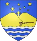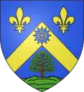 tranché de gueules et d'azur à la bande ondée d'argent brochant sur la partition, accompagnée en chef d'une herse de labour du même et en pointe d'une fleur de lys d'or[16] |