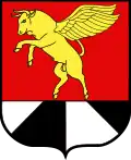 De gueules au taureau ailé d'or sur une champagne gironnée d'argent et de sable.[43] |