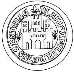 ![]() Blanche de Castille (1188 † 1190), mariée en 1200 à Louis VIII le Lion (1187 † 1226) Son sceau la représente entre six fleurs de lys, son contre sceau montre le château de Castille associé à trois fleurs de lys. Son père portait : de gueules au château donjonné de trois tours d'or ouvert et ajouré d'azur. Plusieurs vitraux contemporains la représentent avec ces armoiries, et le château est un élément héraldique repris par ses fils cadets pour accompagner leur brisure :