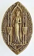 ![]() Marguerite de Provence (1221 † 1295), mariée en 1234 à Louis IX (1214 † 1270) Son sceau la représente couronnée avec le sceptre sous un dais et son contre-sceau montre une fleur de lys fleuronnée (identique à celui de son époux). Son père portait : d'or à quatre pals de gueules. Ses armes sont connues par d'anciennes clés de voûte, un sceau du Cartulaire des cordeliers de Pontoise, et plus récemment un petit objet d'argent, désigné sous le nom de palette[2]. | |