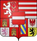 D'or, à l'aigle bicéphale de sable, membrée, becquée et armée de gueules ; sur-le-tout coupé et parti en 3, au premier fascé de gueules et d'argent, au second d'azur semé de lys d'or et au lambel de gueules, au troisième d'argent à la croix potencée d'or, cantonnée de quatre croisettes du même, au quatrième d'or aux quatre pals de gueules au cinquième parti d'azur semé de lys d'or et à la bourdure de gueules, au sixième d'azur au lion contourné d'or, armé, lampassé et couronné de gueules, au septième d'or au lion de sable armé et lampassé de gueules, au huitième d'azur semé de croisettes d'or et aux deux bar d'or. Sur le tout du tout parti d'or à la bande de gueules chargé de trois alérions d'argent et d'or à six tourteaux mis en orle, cinq de gueules, celui en chef d'azur chargé de trois fleurs de lis d'or[58]. |