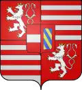 D'or, à l'aigle de sable, membrée, becquée et armée de gueules ; sur-le-tout parti en 1 de gueules, au lion d'argent à la queue fourchée passée en sautoir, couronné, armé et lampassé d'or et en 2 fascé de gueules et d'argent ; sur le tout du tout de gueules à la fasce d'argent[58]. |