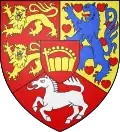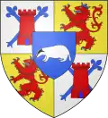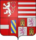 D'or, à l'aigle de sable, membrée, becquée et armée de gueules ; sur-le-tout écartelé en 1 et 4 de sable, au lion d'or, armé, lampassé et couronné de gueules et en 2 et 3 fuselé en bande d'azur et d'argent[58]. |