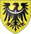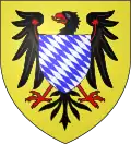 d'or, à l'aigle bicéphale de sable, membrée, becquée et armée de gueules ; sur le tout parti en 1 de gueules à la fasce d'argent, en 2 bandé d'or et d'azur de six pièces à la bordure de gueules[58]. |
