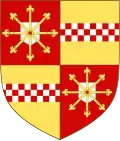 Écartelé, en 1 et 4 de gueules, à l'écusson d'argent, aux rais d'escarboucle d'or, brochantes sur le tout, et en 2 et 3 d'or, à la fasce échiquetée d'argent et de gueules de trois tires[6]. |