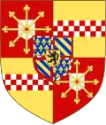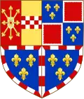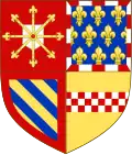 Coupé en 1, parti en 1 de gueules, à l'écusson d'argent, aux rais d'escarboucle d'or, brochantes sur le tout, et en 2 d'or, à la fasce échiquetée d'argent et de gueules de trois tires et en 2 d'azur semé de fleurs de lys d'or à la bordure componée d'argent et de gueules[source insuffisante],[8]. |