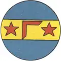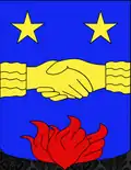 d'azur à la fasce d'or chargée d'une équerre et de deux étoiles de gueules.[10],[4] |