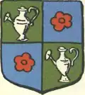 écartelé de sinople à une aiguière d'argent et d'azur à une rose de gueules[8]. |
