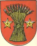 de gueules à une gerbe d'or flanquée de deux étoiles du même.[réf. nécessaire] |