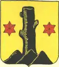 d'or à un écot de sable mouvant d'un mont du même, accosté de deux étoiles de gueules.[6] |