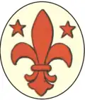 d'argent à une fleur-de-lys de gueules accompagnée en chef de deux étoiles du même.[3] |