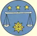 d'azur à une balance d'argent, accompagnée de trois étoiles en chef et d'une pointe de diamant du même en pointe.[3] (Il y a parfois en pointe un croissant, et la balance peut être tenue par un dextrochère mouvant du chef)[2] |