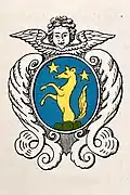 d'azur à un renard d'or, issant d'un mont de trois coupeaux de sinople, accompagné, en chef, de deux étoiles d'or.[8] |