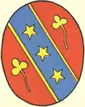 de gueules à la bande d'or chargée d'une bande d'azur (ou de sinople) surchargée de trois étoiles d'or et accompagnée de deux trèfles tigés du même.[2] |
