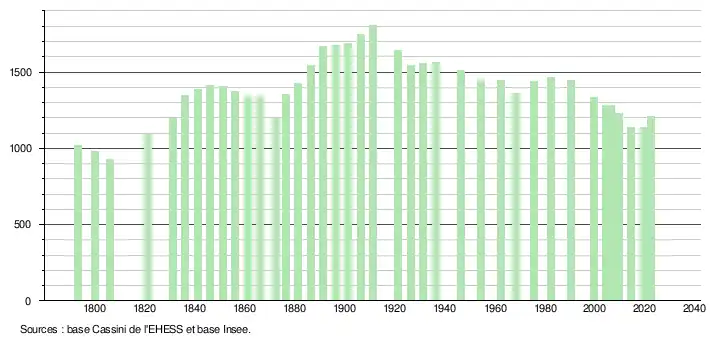 | L'évolution du nombre d'habitants est connue à travers les recensements de la population effectués dans la commune depuis 1793. Pour les communes de moins de 10 000 habitants, une enquête de recensement portant sur toute la population est réalisée tous les cinq ans, les populations de référence des années intermédiaires étant quant à elles estimées par interpolation ou extrapolation[25]. Pour la commune, le premier recensement exhaustif entrant dans le cadre du nouveau dispositif a été réalisé en 2004[26]. En 2022, la commune comptait 1 206 habitants[Note 1], en évolution de +6,82 % par rapport à 2016 (Corrèze : −0,59 %, France hors Mayotte : +2,11 %). |