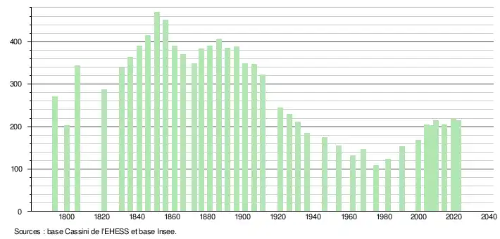 | L'évolution du nombre d'habitants est connue à travers les recensements de la population effectués dans la commune depuis 1793. Pour les communes de moins de 10 000 habitants, une enquête de recensement portant sur toute la population est réalisée tous les cinq ans, les populations de référence des années intermédiaires étant quant à elles estimées par interpolation ou extrapolation[45]. Pour la commune, le premier recensement exhaustif entrant dans le cadre du nouveau dispositif a été réalisé en 2004[46]. En 2022, la commune comptait 214 habitants[Note 6], en évolution de +5,94 % par rapport à 2016 (Ariège : +1,48 %, France hors Mayotte : +2,11 %). |