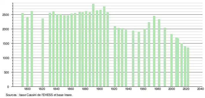 L'évolution du nombre d'habitants est connue à travers les recensements de la population effectués dans la commune depuis 1793. Pour les communes de moins de 10 000 habitants, une enquête de recensement portant sur toute la population est réalisée tous les cinq ans, les populations de référence des années intermédiaires étant quant à elles estimées par interpolation ou extrapolation[14]. Pour la commune, le premier recensement exhaustif entrant dans le cadre du nouveau dispositif a été réalisé en 2008[15].