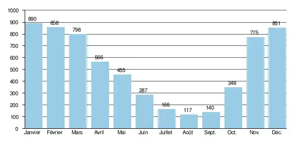 Le débit instantané maximal de 29,00 m3/s a été constaté le en même temps qu'une hauteur maximale instantanée de 211 cm ou 2,11 m[note 2]. Le débit journalier maximal de 12,60 m3/s a été constaté le [2].